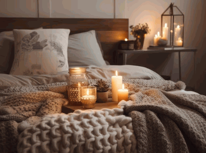This ambiance is achieved through the thoughtful use of warm colors and layered textures, such as plush throws and soft pillows that invite you to sink into the comfort of the space. Natural materials and scents, like wooden furniture and calming essential oils, further enhance the room's serenity.