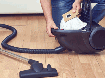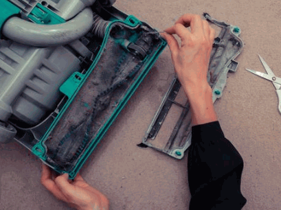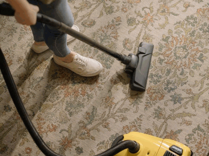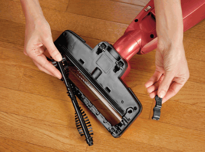 Next, take a quick scan of the carpet and pick up any sizeable debris by hand, like paper scraps or pet toys; this prevents the hoover from getting stuck or losing suction power.